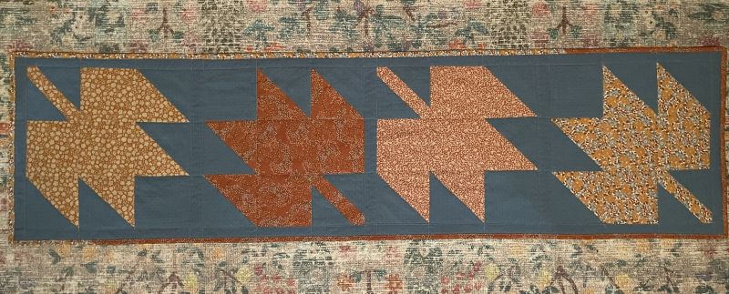 So my updated fowl looks very cute with the pumpkins I made in October and the NEW TABLE RUNNER I just finished!